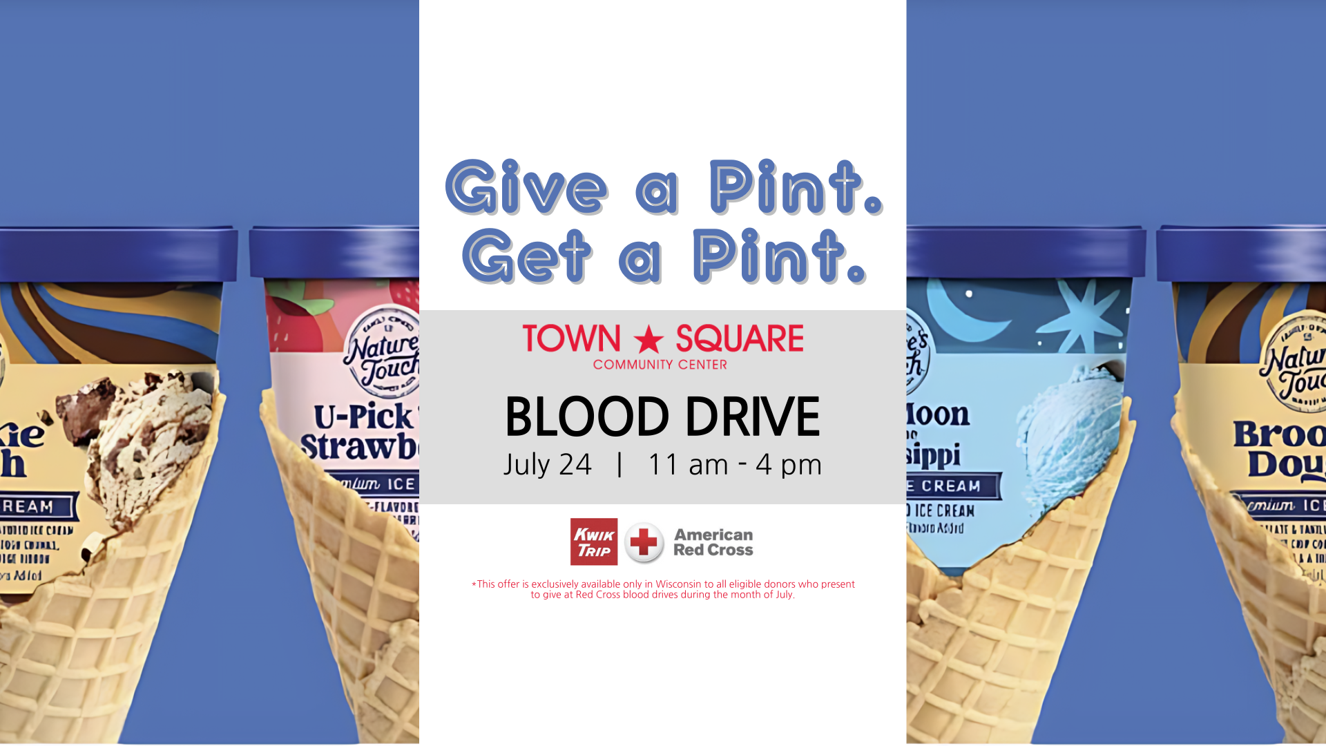 Join us at Town Square for a meaningful (and delicious!) way to make a difference in our community. The American Red Cross is hosting a Blood Drive on July 24, and every eligible donor who gives blood will receive a free pint of Nature’s Touch ice cream, courtesy of Kwik Trip—because heroes deserve a sweet reward. 🍦
