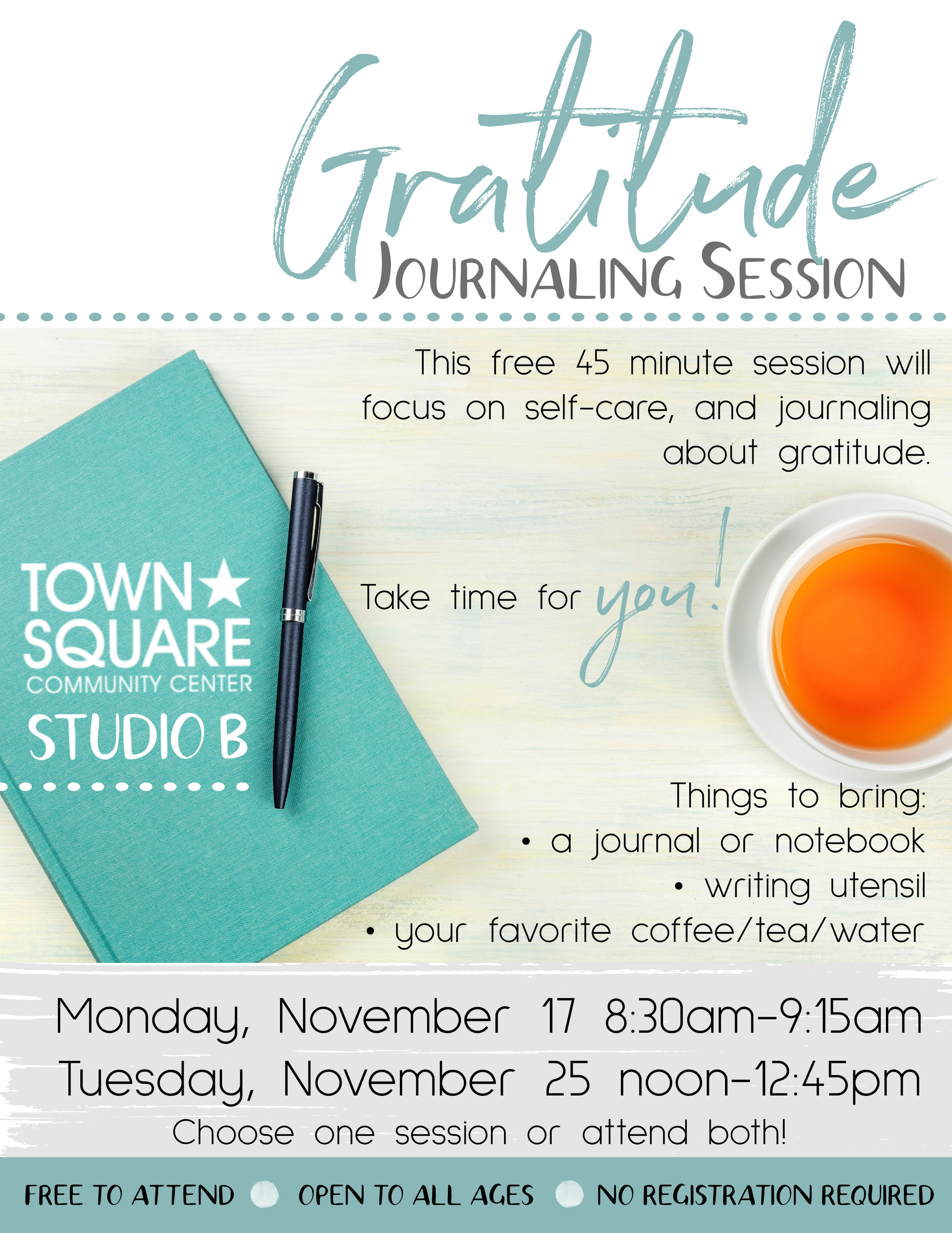 Take a mindful pause and focus on what truly matters at Town Square’s Gratitude Journaling Sessions in Studio B. These free, 45-minute sessions are open to all ages and require no registration. Just bring a journal or notebook, a writing utensil, and your favorite coffee, tea, or water. Each session will guide participants through gentle prompts and quiet reflection, offering time to slow down, write, and reconnect with gratitude in a welcoming, peaceful setting.