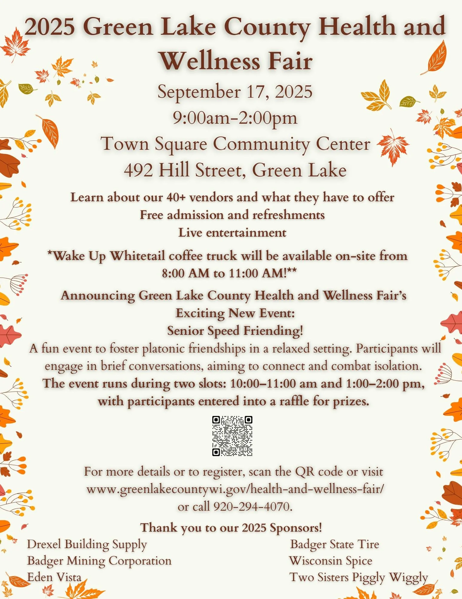 Join us for the annual Green Lake County Health and Wellness Fair, a free community event featuring over 40 vendors sharing resources, products, and services to support healthy living. Guests can enjoy live entertainment, free refreshments, and engaging activities throughout the day.