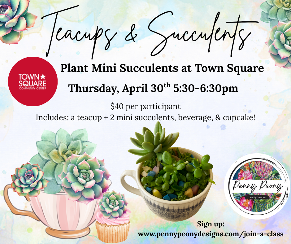 Join us while we plant together adorable mini succulents in vintage and thrifted teacups! This fun class is a great one to do with any ages and great to do with friends. Fee includes all supplies (2 mini succulents, planting supplies, and teacup of your choice), one beverage, and one succulent cupcake to enjoy! Fees are nonrefundable. This is located inside the Town Square in Green Lake in the Ballroom.