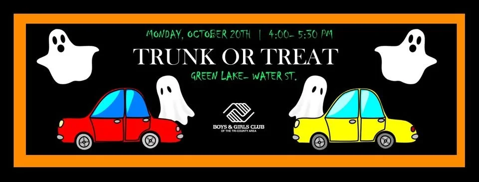 Trunk or Treat is coming back to Green Lake! Join us for this family friendly event hosted by Boys and Girls Club. This safe, fun and FREE kids' event is open to the public. Dress up in your ghoulish costume and visit area businesses' trunks for various treats! Rain or shine! Inclement weather will move the event indoors at Town Square.
