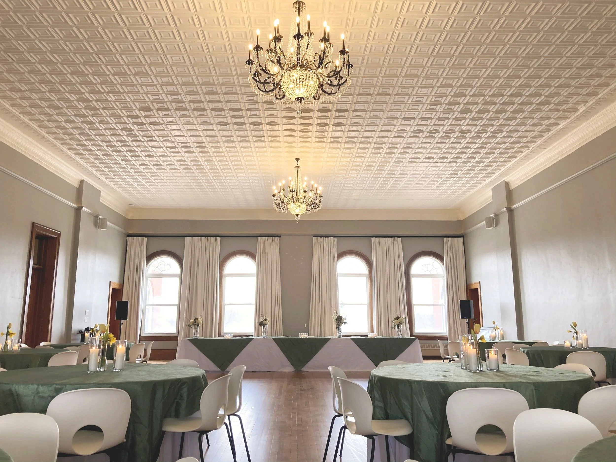 Returned to its original glory in 2021, the historic courtroom has been transformed into Town Square’s most elegant event space. With its double-door entry, soaring vintage metal ceilings, crystal chandeliers, original hardwood floors and gorgeous arched windows overlooking the Mill Pond, the ballroom is the perfect space for your event.